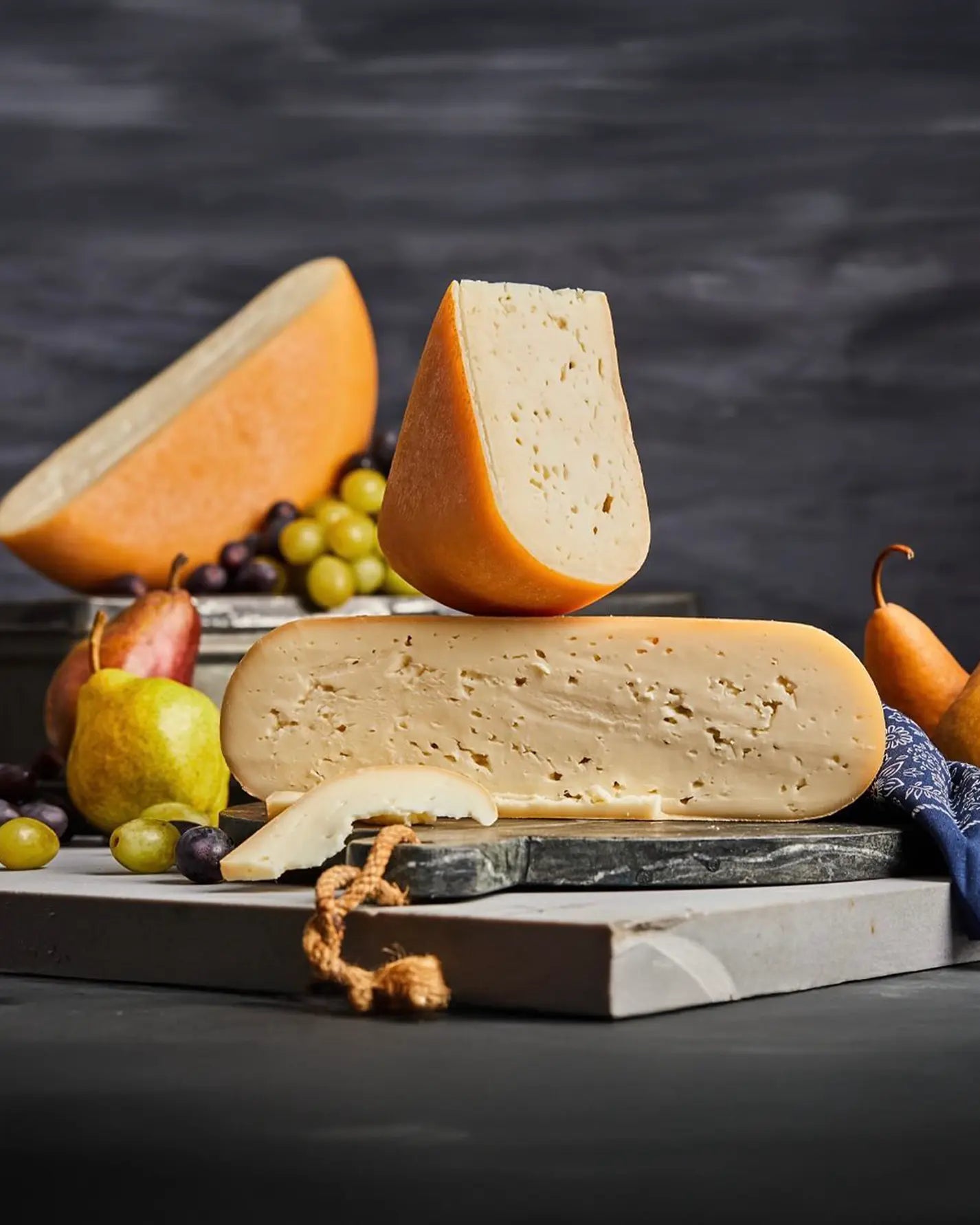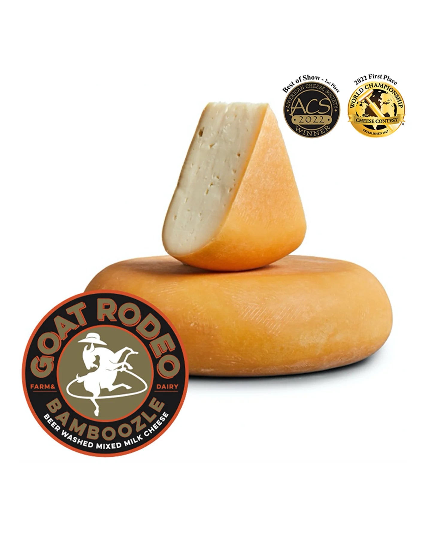 Supple, semi-soft texture with notes of prosciutto and peanuts, this washed rind goat and cow’s milk cheese is aged for at least two months and washed with beer from Cinderlands Beer Co. Equally at home on a cheese board or melted on a burger. Available in 9 lb. wheels.