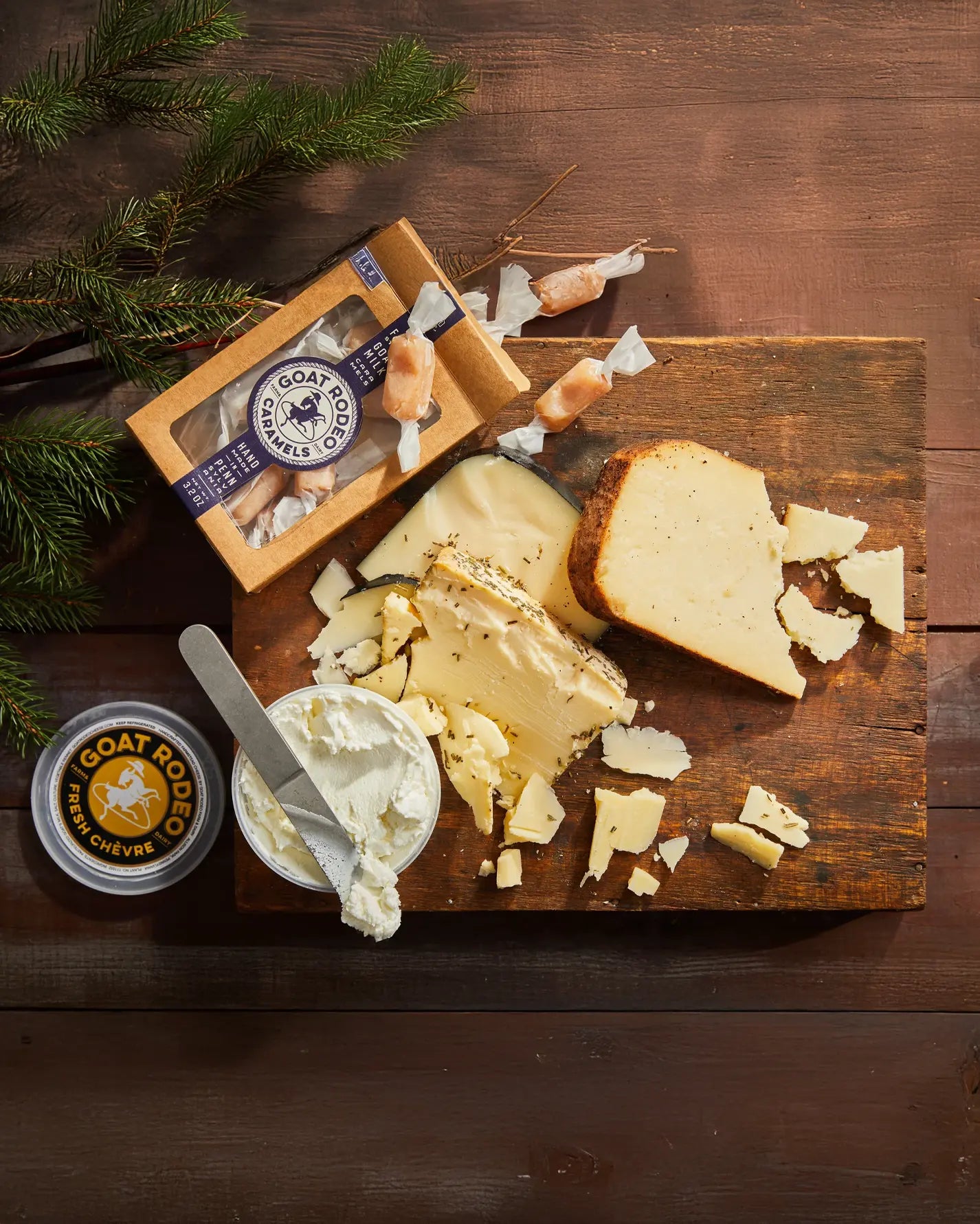 Goat Rodeo cheese plate assortment featuring four of our favorite handcrafted cheeses and a box of our addictive goat’s milk caramels: