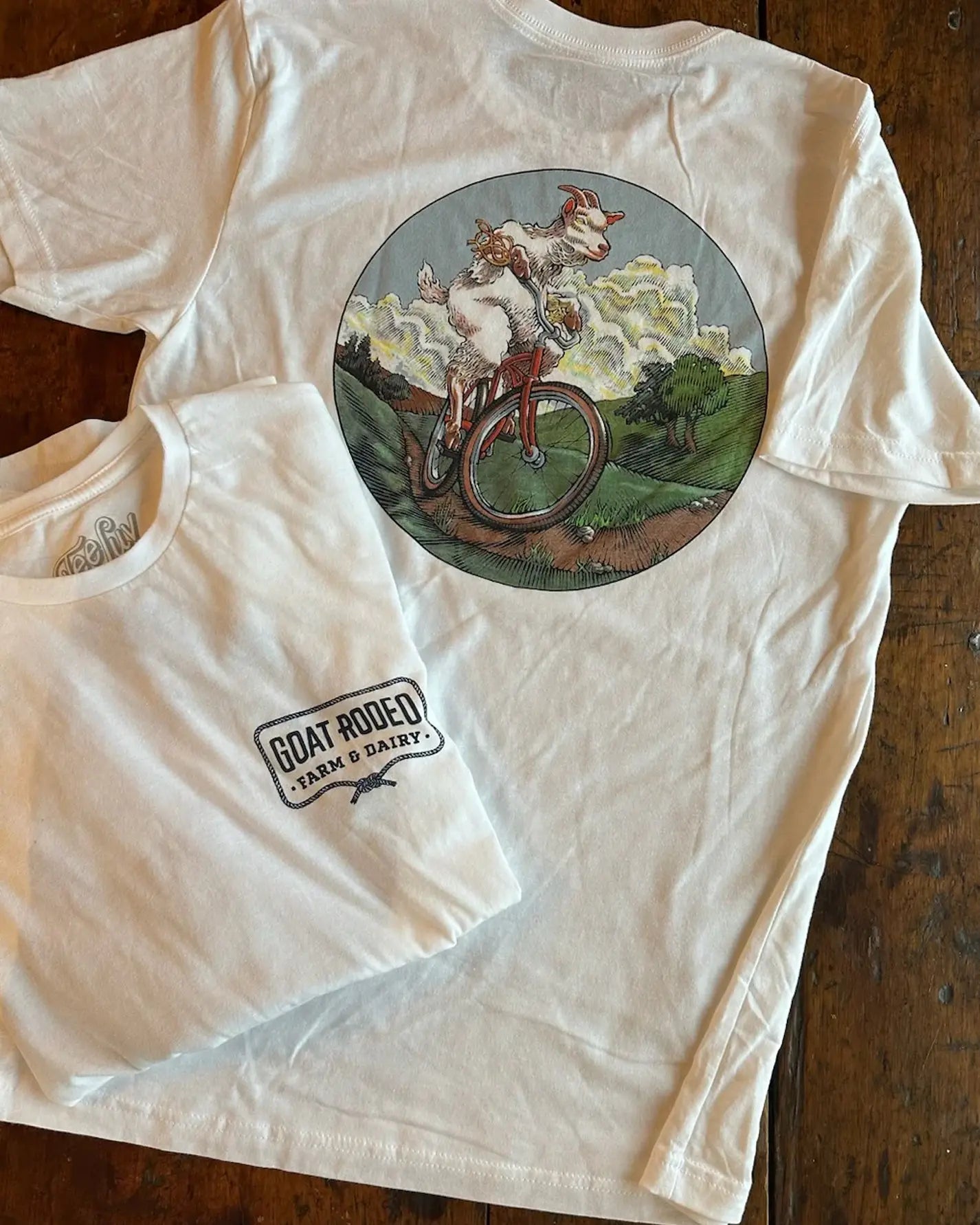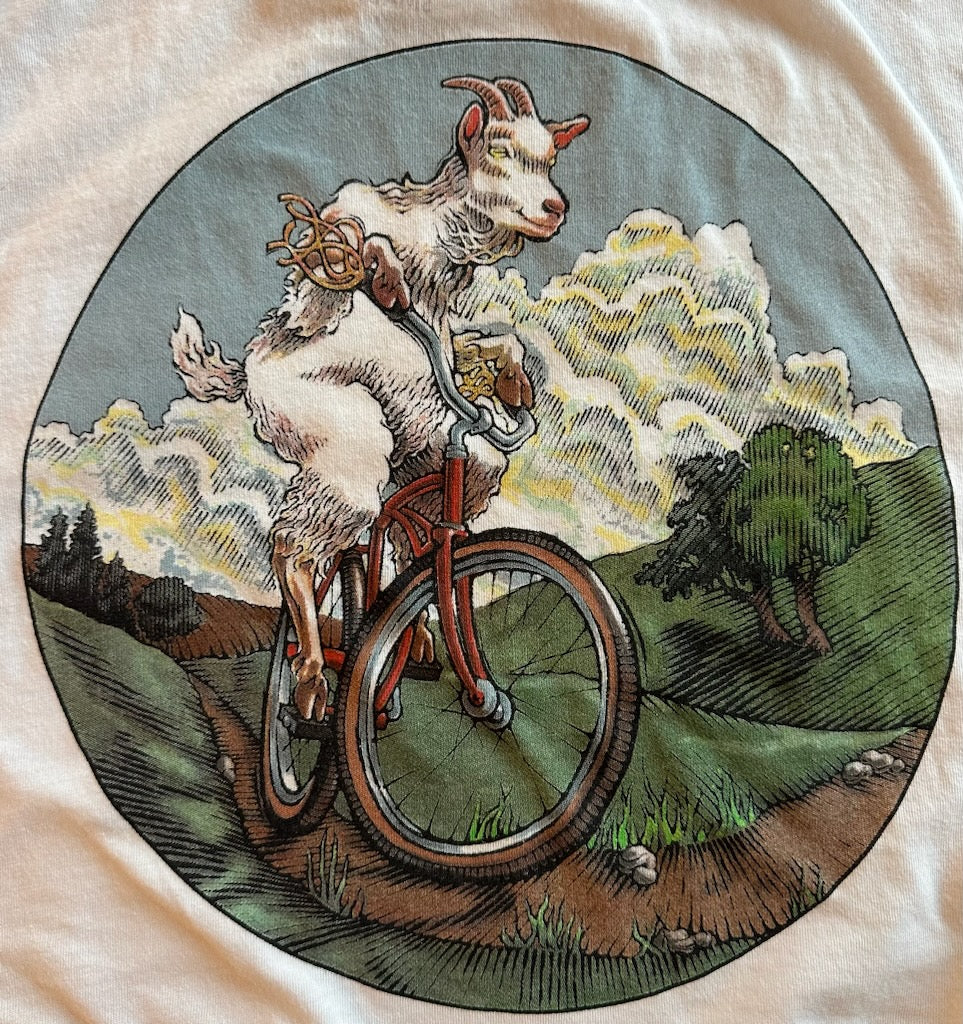 Goat Rodeo Farm & Dairy logo on the left chest and a full back mountain goat on a bike print on a super soft cotton/blend tee. Choose short or long sleeve options.
