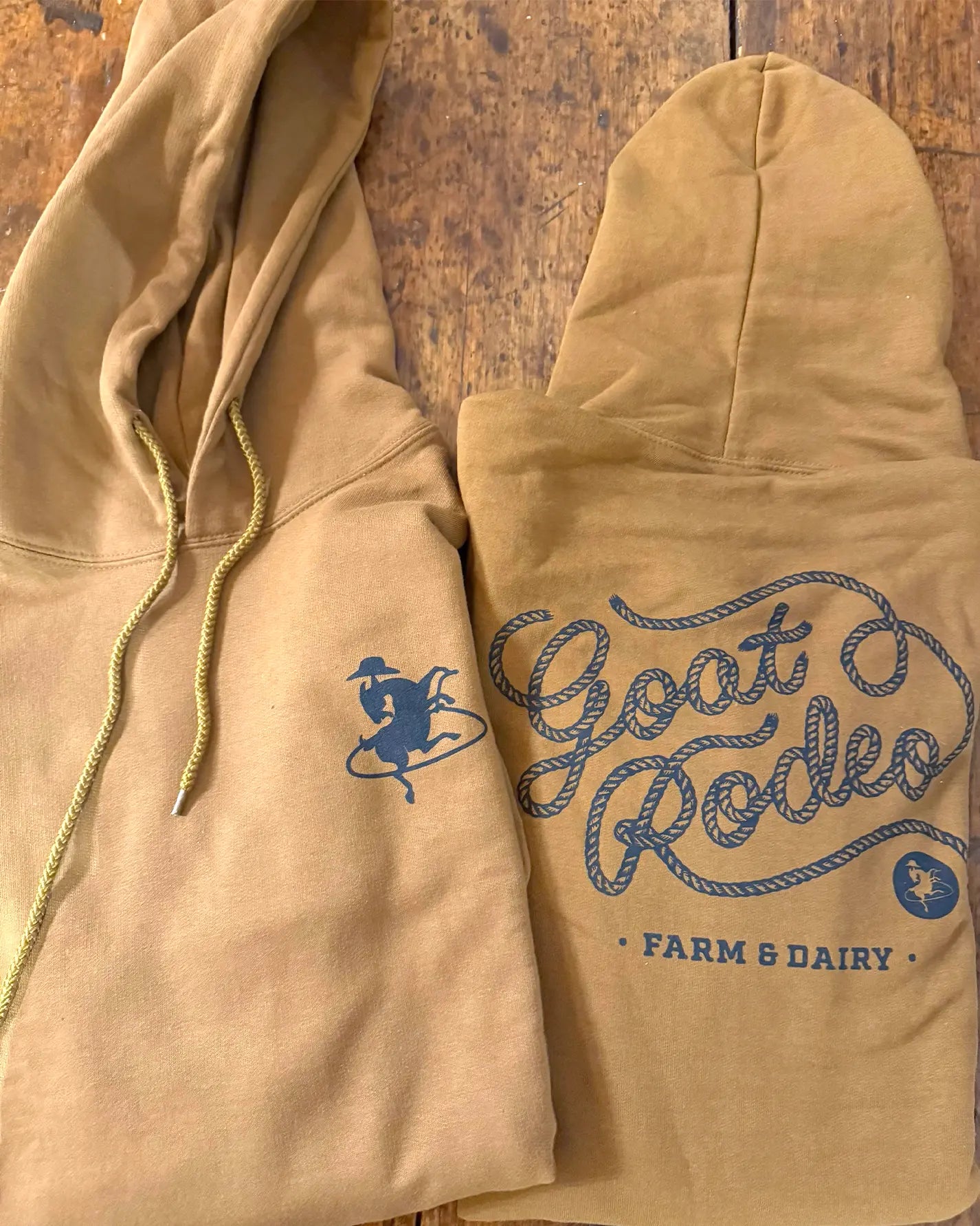 Goat Rodeo Farm & Dairy left chest and full back logos printed on the highest quality, poly-cotton tan hoodie we could find.