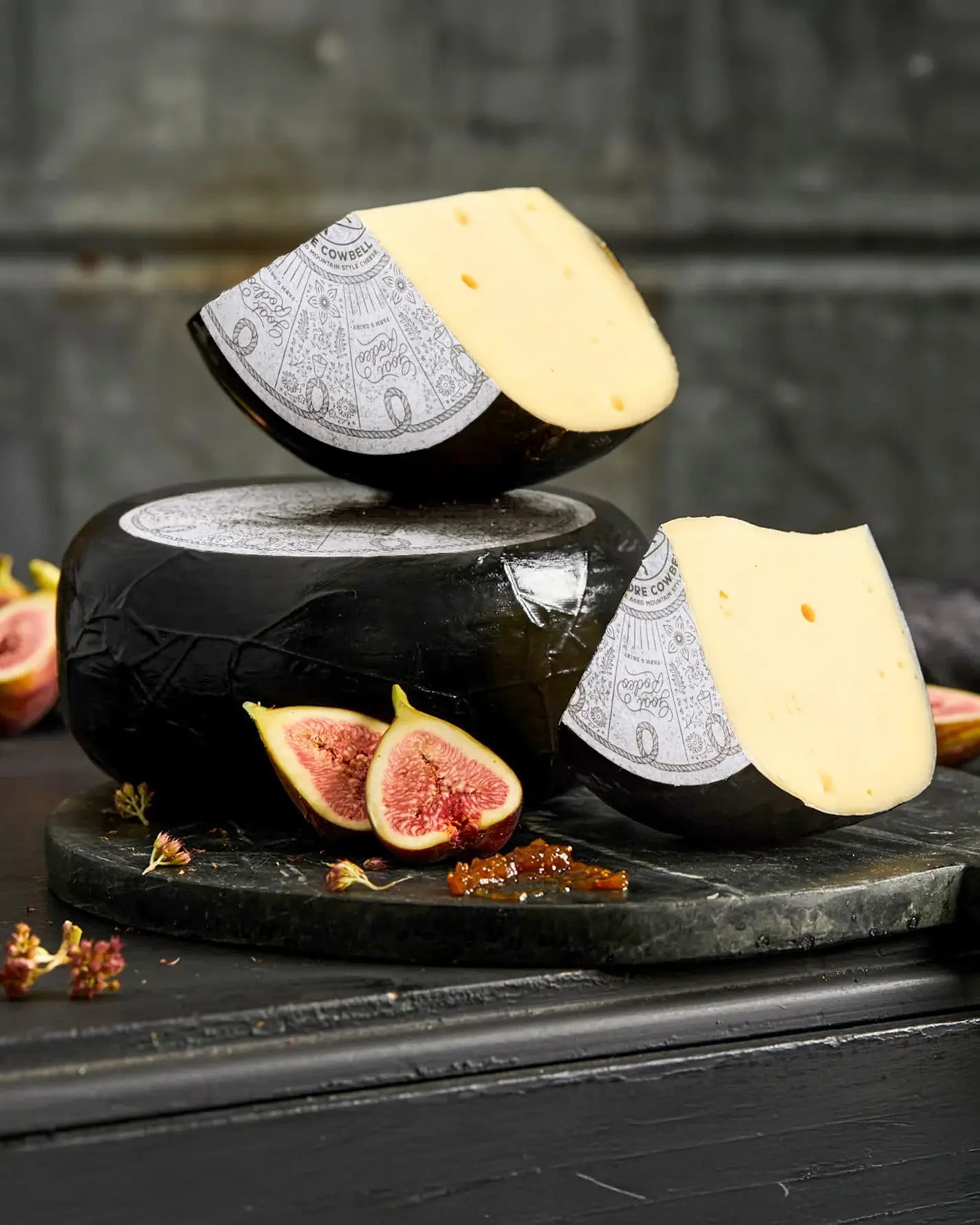 A semi-firm cave aged cheese made from local farm’s cow’s milk in a unique black cream wax rind. The complex herbal flavor pairs well with mild younger red wines like Beaujolais or drier white wines like Sancerre. Crafted in 9 pound wheels.